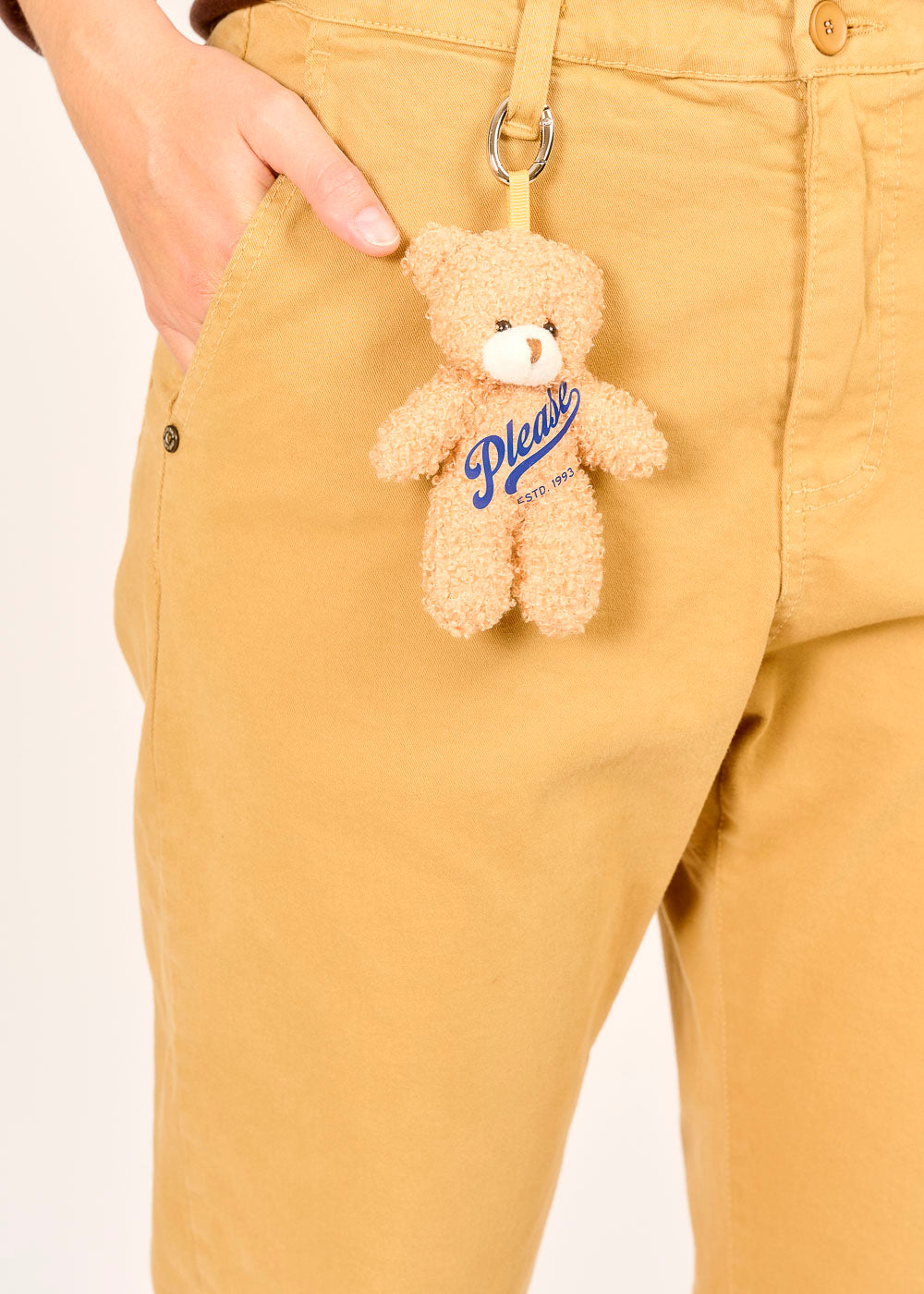 Die Chino von PLEASE in der warmen Nuance caramello vereint lässigen Chic mit einem verspielten Detail. An der Vorderseite hängt ein kleiner Teddybär, der sich im Handumdrehen abnehmen und als stylischer Taschenanhänger nutzen lässt. Der bequeme Schnitt und die hochwertige Verarbeitung machen die Hose zum perfekten Allrounder für jeden Tag. So entsteht ein Look, der Individualität und Trendbewusstsein charmant verbindet.