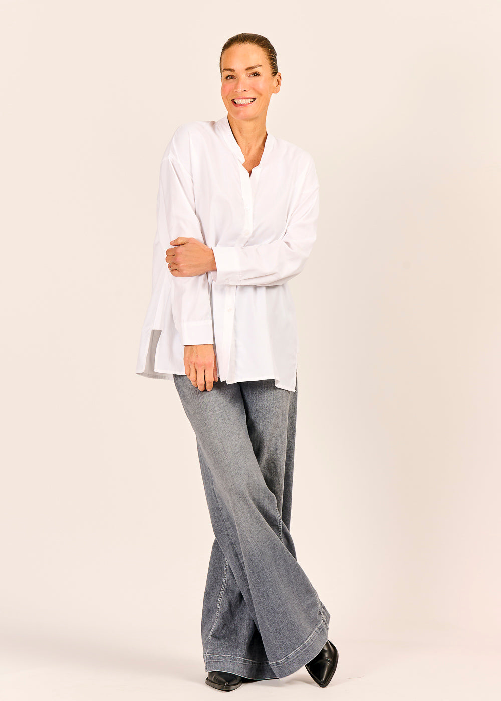 Diese strahlend weiße Bluse ist ein zeitloses Essential, das Eleganz und lässigen Chic perfekt vereint. Der moderne Stehkragen ohne klassischen Umschlag (Mao-Kragen-Stil) verleiht ihr eine minimalistische und zugleich anspruchsvolle Note. Dank ihres lockeren, fließenden Schnitts lässt sich dieses vielseitige Basic mühelos zu allem von Jeans bis hin zu eleganten Stoffhosen kombinieren.